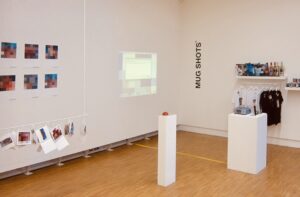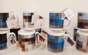 The classroom in the Royal Academy of Art looks like a souvenir shop. T-shirts, pillows, bottles of wine. On a shelf are mugs. A block pattern of colorful pixels is printed on everything. Against a wall, a pixel film is running. Mug Shots, the photographer calls his graduation project.