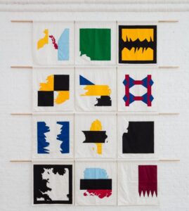The series ‘The Flag Factory’ shown at the exhibition, is an installation of prints and sewn flags drawn from his childhood memory of collecting bubblegum cards of the flags of the world. The cardboard cut-out figures are photographs of African soldiers sourced from the Weston Library in Oxford. He uses cardboard to reference their expendable status by colonial powers in combat. He questions the nature of national and sovereign identities to seek out shared sense of humanity.
