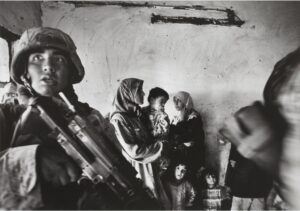 The front cover of the catalogue for the Women on the Front Line exhibition features a photograph of her taken during a house search in the Abu Ghraib district of Baghdad. What strikes me about the photograph is the palpable tension present on both sides, evident in both the heavily armed young Marine and the family being held at gunpoint. There seems to be just as much fear in the gaze of one as the other.